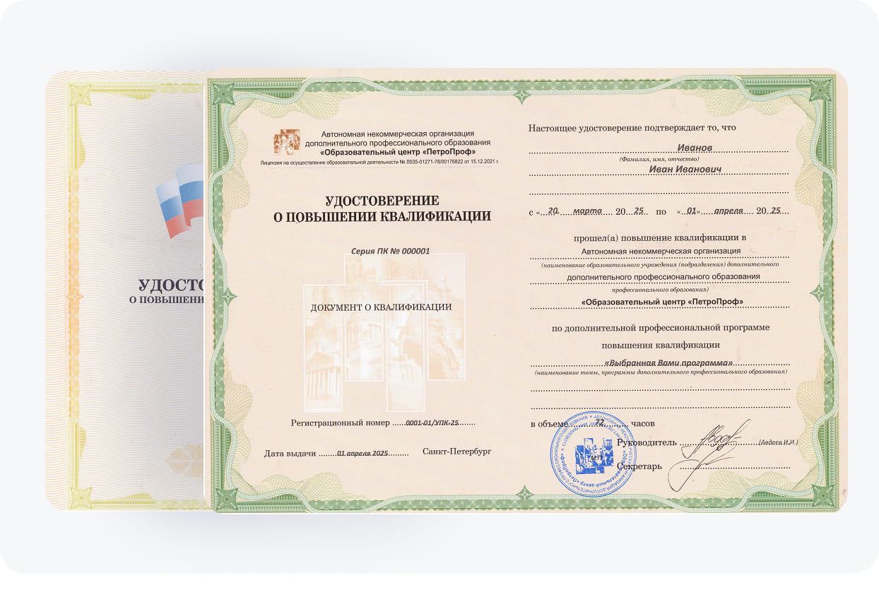 УПК — это документ об образовании государственного образца, выданный нашим аккредитованным учебным центром, имеющим лицензию на образовательную деятельность. Наличие удостоверения о повышении квалификации позволит вам подтвердить свои профнавыки перед работодателями и коллегами, повысить шансы на карьерный рост и увеличение заработной платы.